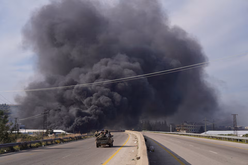 Smoke rises while members of the Syrian forces ride on a vehicle as they battle against a nascent insurgency by fighters from ousted leader Bashar al-Assad’s Alawite sect, in Latakia, Syria, March 7, 2025. REUTERS/Karam al-Masri Purchase Licensing Rights, opens new tab