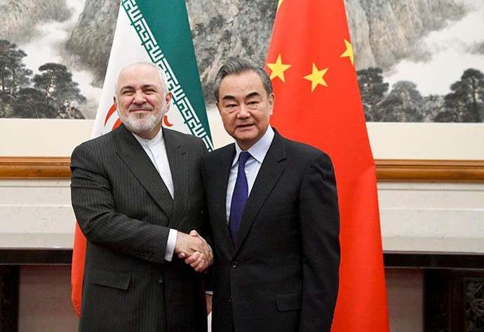 Ο υπουργός Εξωτερικών της Κίνας Wang Yi (R) δίνει τα χέρια με τον Υπουργό Εξωτερικών του Ιράν Mohammad Javad Zarif κατά τη συνάντησή τους στον State Guesthouse Diaoyutai στο Πεκίνο στις 31 Δεκεμβρίου 2019.
