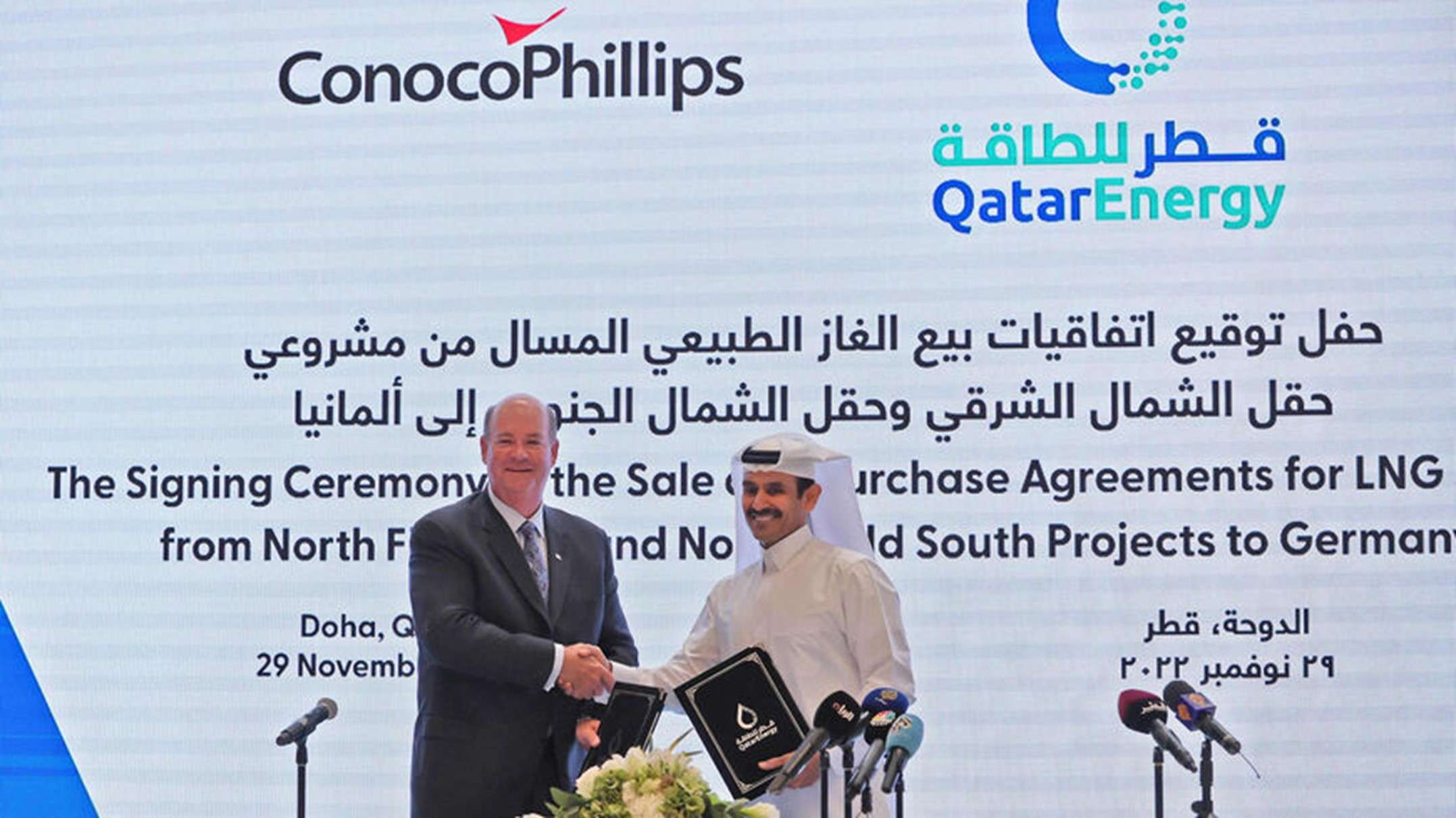 Ο Saad Sherida al-Kaabi (R), υπουργός Ενέργειας του Κατάρ και Διευθύνων Σύμβουλος της QatarEnergy, και ο Ryan Lance (L), Διευθύνων Σύμβουλος της πολυεθνικής εταιρείας ConocoPhillips, ανταλλάσσουν έγγραφα κατά τη διάρκεια συνέντευξης Τύπου που ανακοινώνει μια νέα συμφωνία, Ντόχα, Κατάρ, 29 Νοεμβρίου 2022