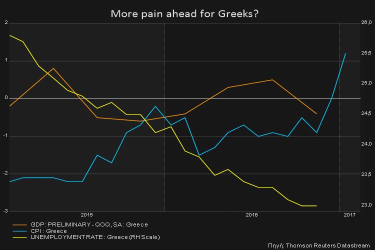 Υπάρχουν πάντως και κάποια καλά νέα, σημειώνει το Reuters. Σε ετήσια βάση, η Ελλάδα πέτυχε μικρή ανάπτυξη για το 2016, 0,3%, ξεπερνώντας τις προηγούμενες προβλέψεις που έβλεπαν συρρίκνωση 0,3% του ΑΕΠ. Στο δημοσιονομικό μέτωπο, συνεχίζει το δημοσίευμα, φαίνεται ότι θα ξεπεράσει τον στόχο του 0,5% του πρωτογενούς πλεονάσματος, φτάνοντας στο 2%. Ομως, αυτά αντικατοπτρίζουν συνολικά την περασμένη χρονιά και όχι τους τελευταίους μήνες, παρατηρεί το Reuters.