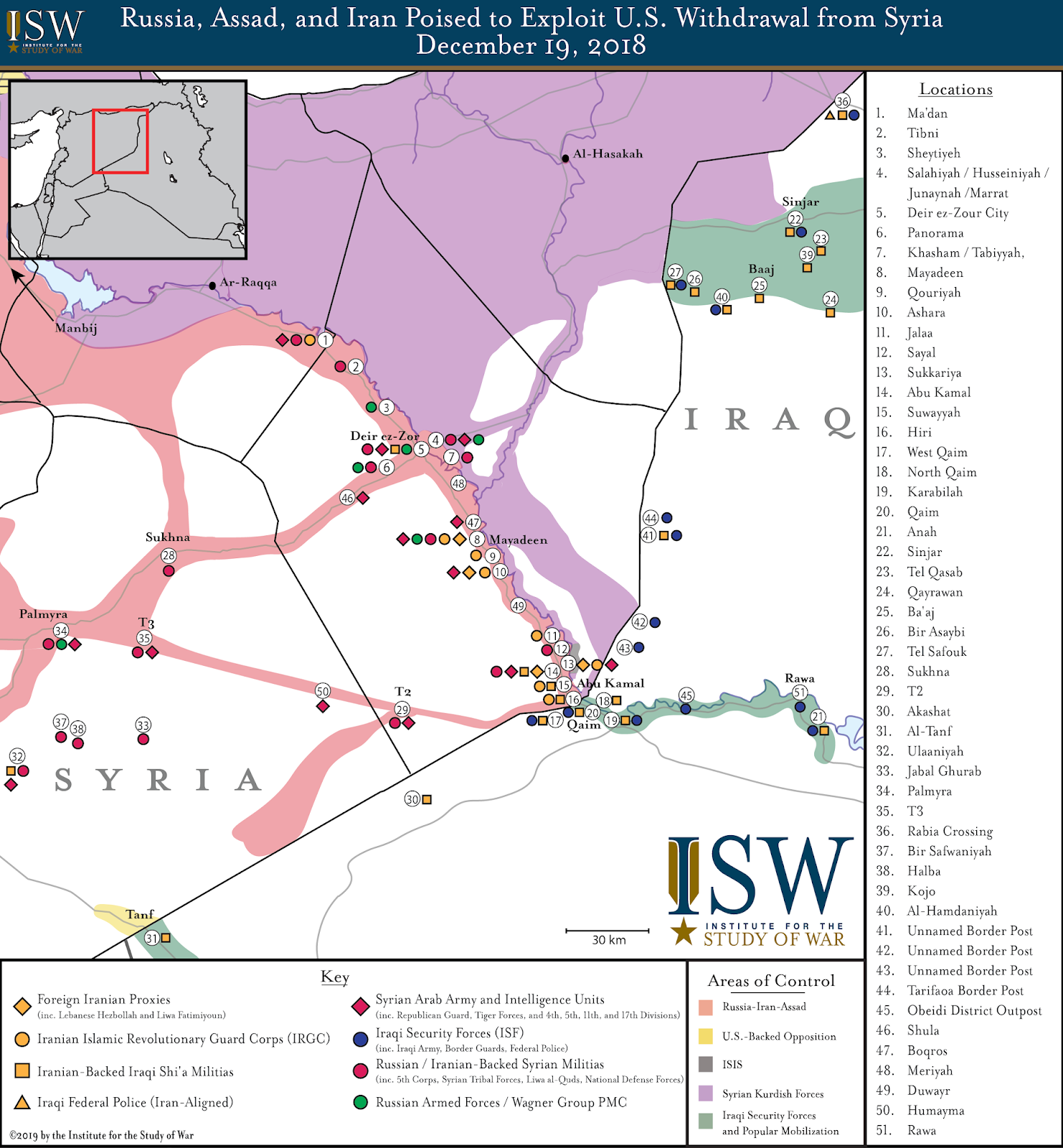 The map below depicts the Russo-Iranian Coalition’s known positions in Eastern Syria and Western Iraq as of January 3, 2019. The graphic has also been updated to depict positions held by the SAA and Iraqi Security Forces (ISF). Position locations are based on information available in open sources reviewed by the Institute for the Study of War. The map does not show positions held by the Syrian Democratic Forces (SDF) or U.S. Anti-ISIS Coalition.