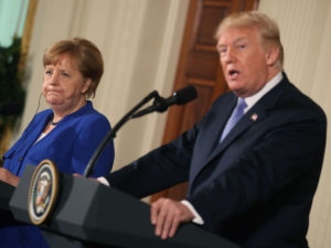 Germany’s point-blank refusal to support Washington’s proposal for a maritime protection force in the Arabian Gulf to protect shipping from attacks by Iran is yet another example of Berlin’s diplomatic and economic sabotage of the Western alliance. Pictured: U.S. President Donald Trump and German Chancellor Angela Merkel at a press conference on April 27, 2018 in Washington, DC. (Photo by Mark Wilson/Getty Images)