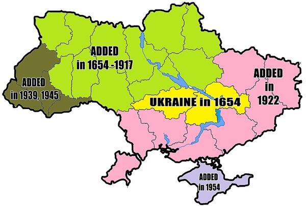 Κατά τη διάρκεια αυτής της κομμουνιστικής οικοδόμησης κράτους, ιδού πώς και πότε οι βάναυσοι αυτοί τύραννοι προσάρτησαν κάθε τμήμα του σημερινού ουκρανικού χάρτη στα εδάφη που είχαν αποκτηθεί ή καταληφθεί από τους Ρώσους τσάρους την περίοδο 1654–1917 (κίτρινη περιοχή):