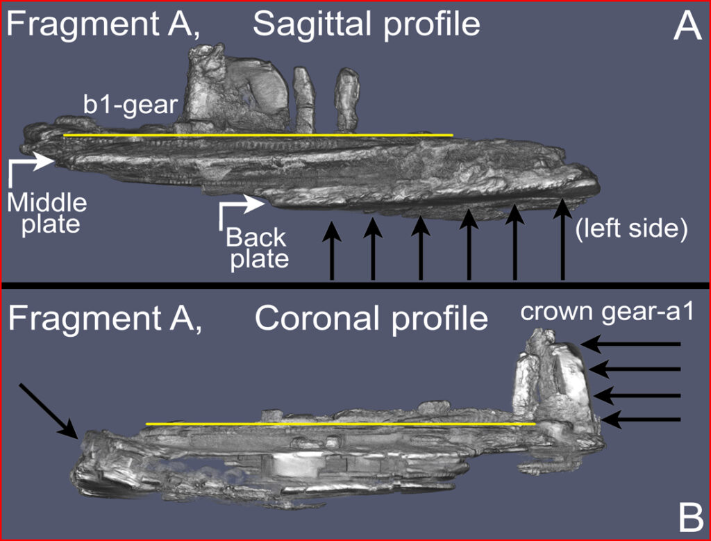 Left: Image of the central area of Fragment A showing gear b1 with its four spokes. Right: snapshot of the random break on part of one spoke. No trace of bronze survives inside the spoke, having been replaced by Atacamite (Voulgaris et al., 2022).