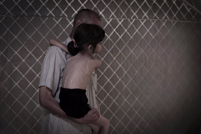 Ένας άνδρας κρατά στην αγκαλιά του ένα παιδί με σοβαρότατο υποσιτισμό.