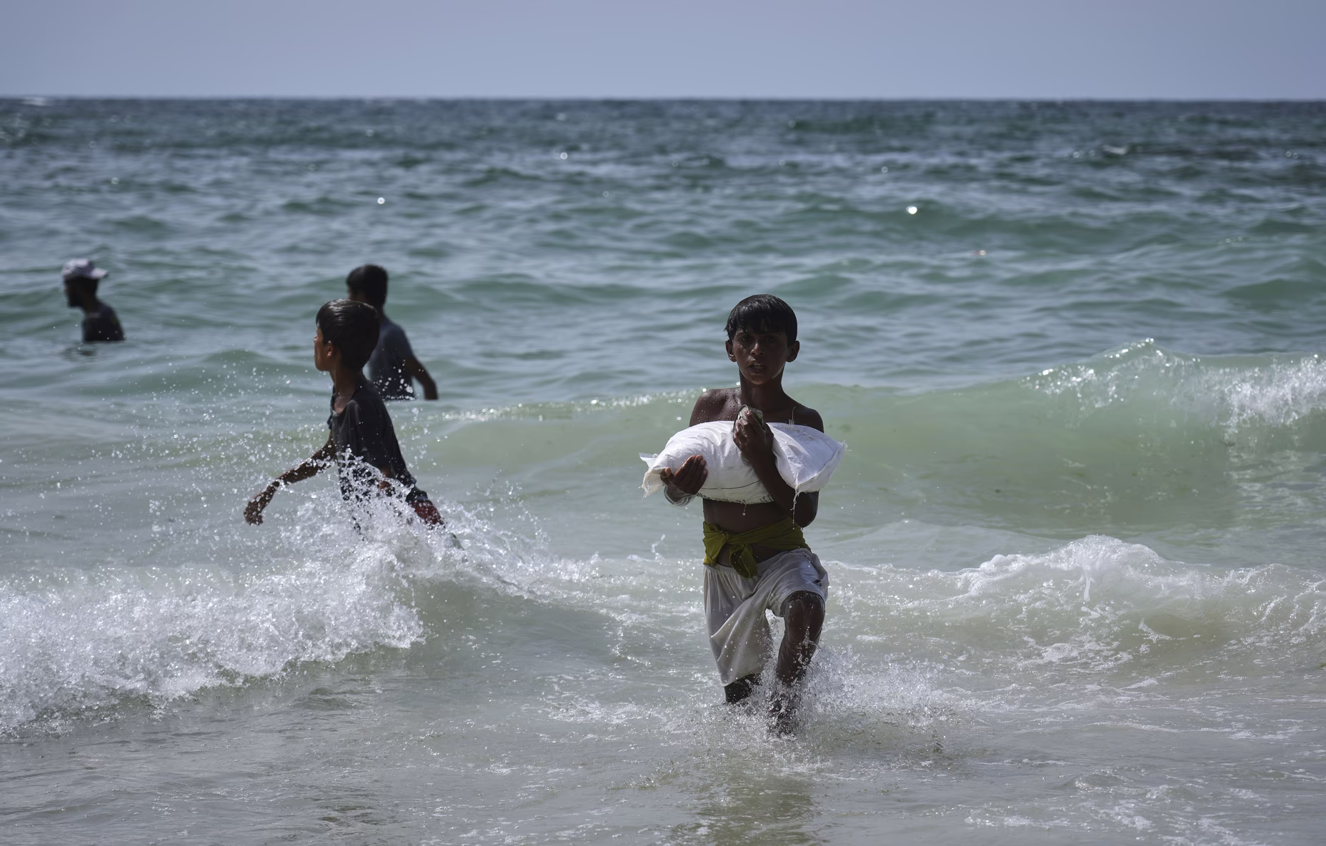 Παλαιστίνιος νεαρός μεταφέρει σακί βοήθειας που έπεσε στη Μεσόγειο Θάλασσα, ανοικτά της Ζαουάιντα, μετά από εναέρια ρίψη πάνω από το κεντρικό τμήμα της Γάζας στις 29 Ιουλίου 2025.