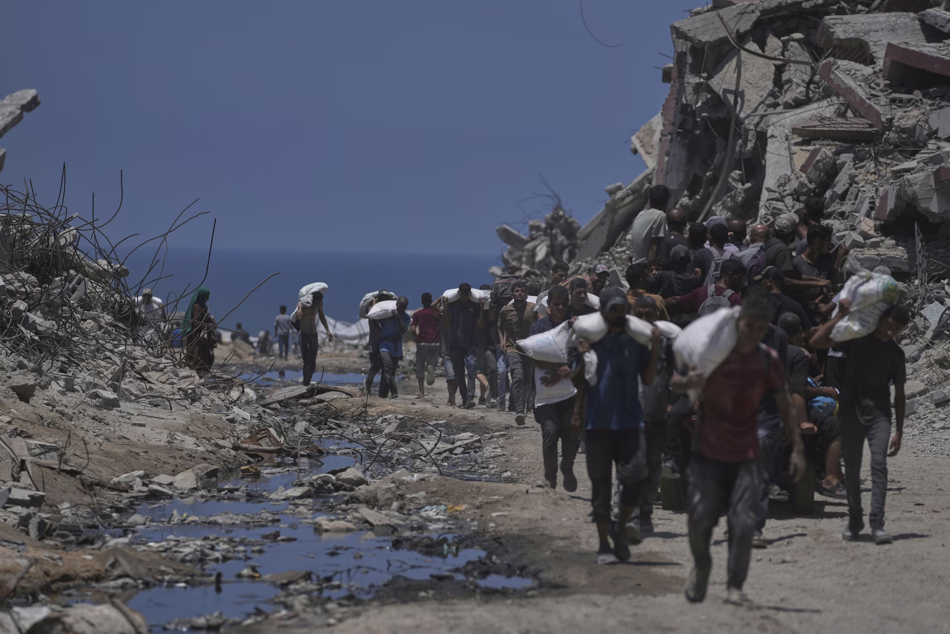 Παλαιστίνιοι μεταφέρουν βαριά σακιά αλεύρι μακριά από σημείο διανομής στην περιοχή Ζικίμ στις 27 Ιουλίου 2025.
