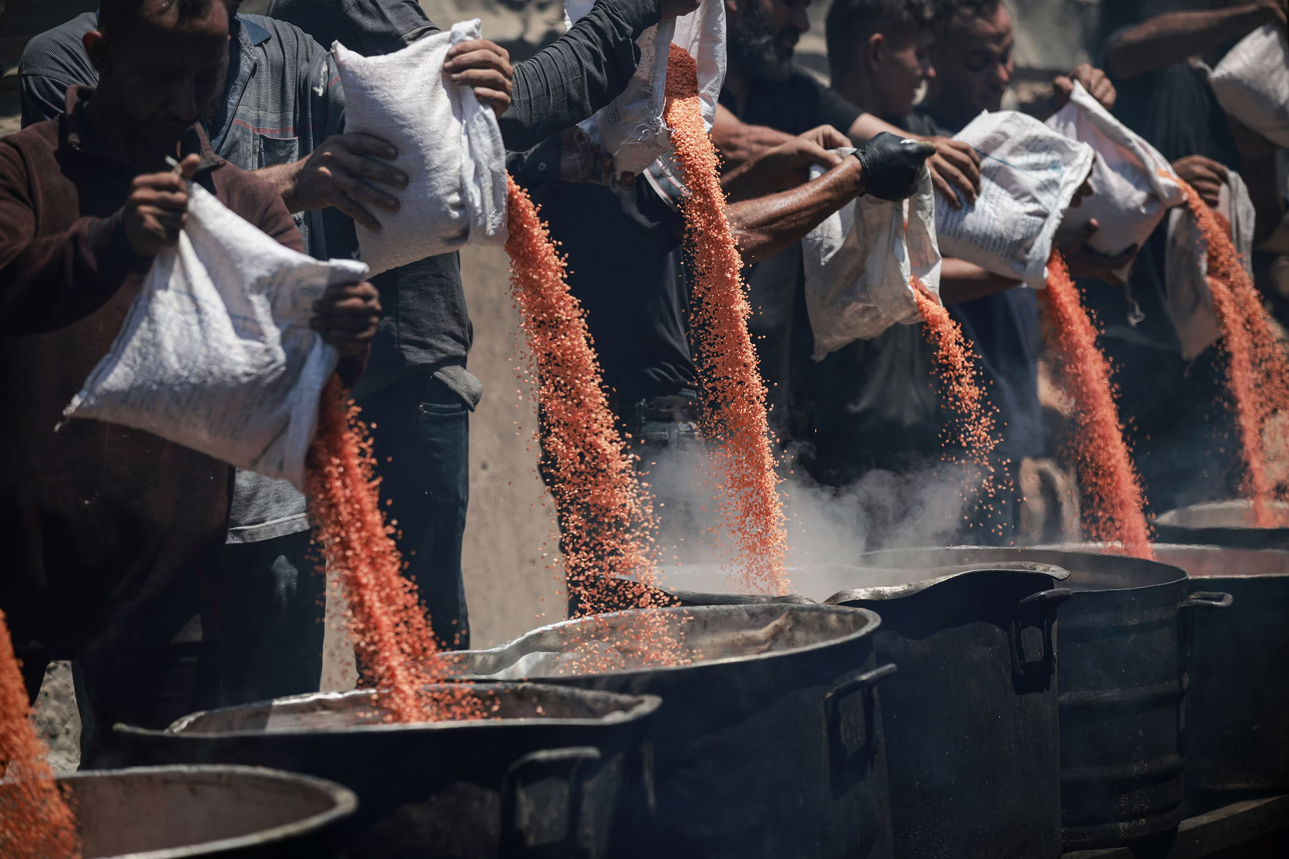 Σακιά με φακές χύνονται σε μεγάλα καζάνια μαγειρέματος σε σημείο διανομής τροφίμων που διαχειρίζεται φιλανθρωπικός οργανισμός στη Λωρίδα της Γάζας, στις 18 Ιουλίου 2025.