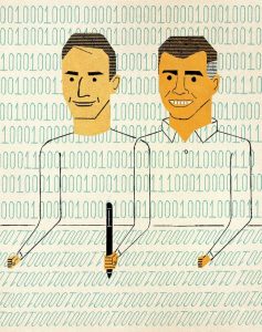 After years of sharing their working lives, duos sometimes develop a private language, the way twins do. They imitate each other’s clothing and habits. A sense of humor osmoses from one to the other. Apportioning credit between them becomes impossible. But partnerships of this intensity are unusual in software development. Although developers sometimes talk about “pair programming”—two programmers sharing a single computer, one “driving” and the other “navigating”—they usually conceive of such partnerships in terms of redundancy, as though the pair were co-pilots on the same flight. Jeff and Sanjay, by contrast, sometimes seem to be two halves of a single mind. Some of their best-known papers have as many as a dozen co-authors. Still, Bill Coughran, one of their managers, recalled, “They were so prolific and so effective working as a pair that we often built teams around them.”