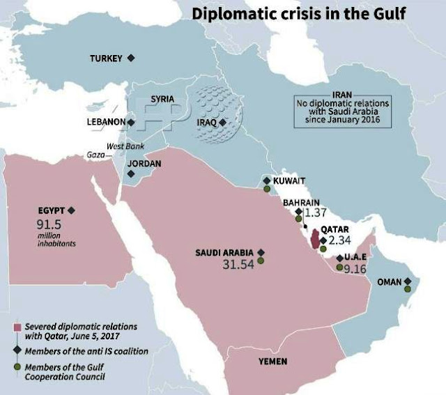 The Qatari government and its mouthpiece Al-Jazeera installed and supported the Muslim Brotherhood government in Egypt. The Saudis put that government down by financing a military coup against it. Qatar is supporting the Muslim Brotherhood government of Turkey. It is supporting the Palestinian Hamas, also a Muslim Brotherhood affiliate. Qatar is financing various al-Qaeda aligned groups in Libya, Syria and Afghanistan. The Taliban have their only diplomatic mission in Doha. Until recently the Saudis have been financing ISIS. They are now mainly back at financing various other Jihadi groups in Syria under CIA control. The UAE is sponsoring the Libyan general Hiftar who is fighting Qatari supported al-Qaeda aligned groups. The Saudis are making nice with Israel and have no interest in the Palestinian cause which Qatar supports.