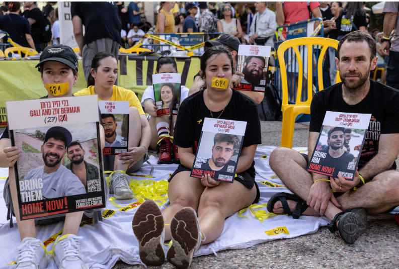 Υποστηρικτές σφραγίζουν τα στόματά τους με ταινία στην οποία αναγράφεται ο αριθμός 681 — οι ημέρες που κρατούνται όμηροι στη Γάζα από την επίθεση της Χαμάς στις 7 Οκτωβρίου 2023 — σε συγκέντρωση στο Τελ Αβίβ στις 17 Αυγούστου. (Heidi Levine/For The Washington Post)
