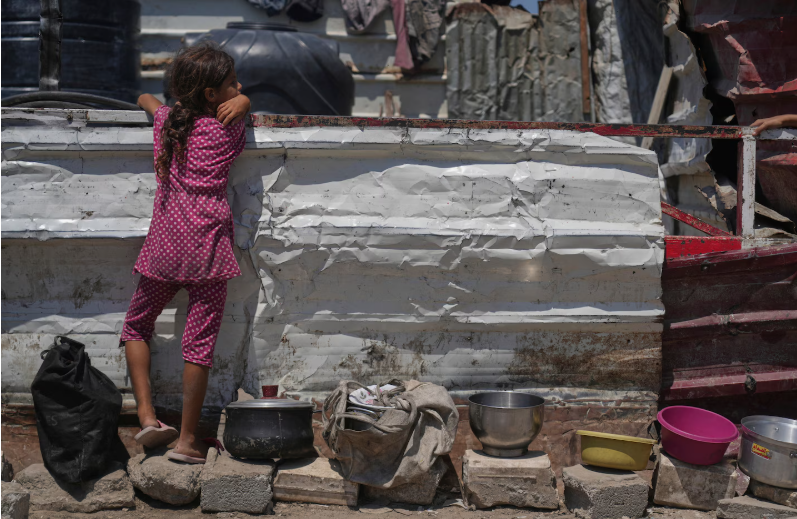 Ένα Παλαιστινιόπουλο περιμένει σε κοινοτική κουζίνα πριν από τη διανομή δωρεάν φαγητού στην Πόλη της Γάζας, στις 22 Αυγούστου. (Abdel Kareem Hana/AP)