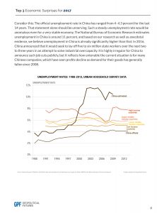 Last, and certainly not least, is China. 2016 turned out to be the year the world realized that what GPF founder George Friedman has been saying about China for years really was true: China’s preternatural growth rates could not be sustained forever. Eventually, the Chinese growth miracle would come to an end, and China would face a choice – the imposition of a dictatorship or a collapse into the regionalism that has defined much of Chinese history. The dictatorship of President Xi Jinping has been advancing for some time, and 2017 will be the year that Xi eliminates the last of his rivals and solidifies his control over the political system. This will be necessary because as China’s underlying economic problems continue to mount, unemployment will begin to rear its head, and that is an extremely dangerous problem for the stability of China’s political system. Top 3 Economic Surprises for 2017 6