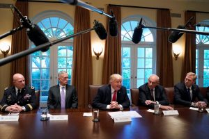 About an hour earlier, Trump met with senior military leaders, including his National Security Advisor H.R. McMaster, Secretary of Defense James Mattis, and Chief of Staff John Kelly.