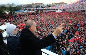 Turkish President Recep Tayyip Erdogan addresses his supporters next to his wife, Emine Erdogan, during a rally Sunday in Bursa, Turkey. (Reuters)