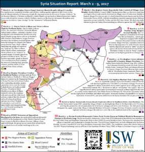 These graphics mark the latest installment of our Syria SITREP Map made possible through a partnership between the Institute for the Study of War and Syria Direct. The graphic depicts significant recent developments in the Syrian Civil War. The control of terrain represented on the graphic is accurate as of March 3, 2017.