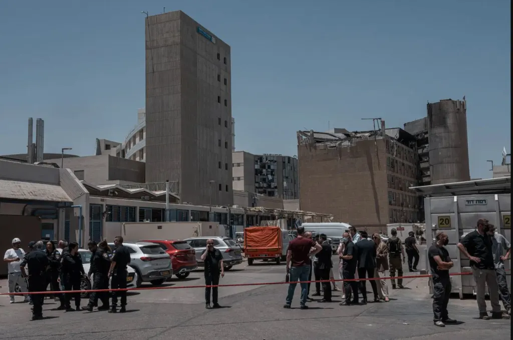 Εργαζόμενοι στο Ιατρικό Κέντρο Soroka στην Beersheba του Ισραήλ, την Πέμπτη, αφού κτίρια χτυπήθηκαν σε πυραυλική επίθεση του Ιράν