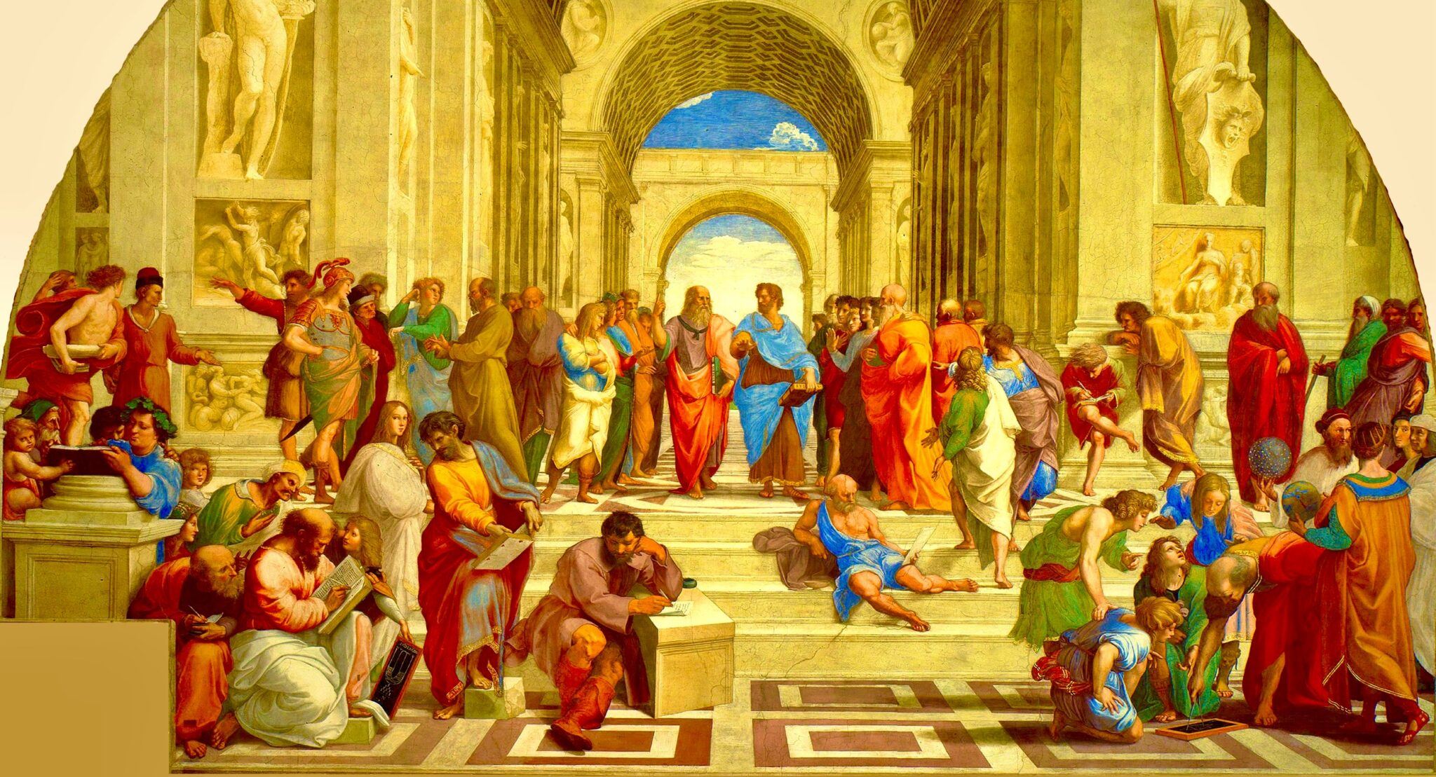 School of Athens by Raphael (Raffaello Sanzio da Urbino), 1511. Fresco. Pinacoteca Ambrosiana, Vatican Museum. Greek thinkers include philosophers Herakleitos, Pythagoras, Parmenides, Socrates, Plato and Aristotle (center). Diogenes of Sinope (in front of Aristotle and Plato, on the floor). Philosopher Hypatia murdered by Christian monks (in 415, lower left wearing a while robe), and Alexander the Great (left above Hypatia). Public Domain