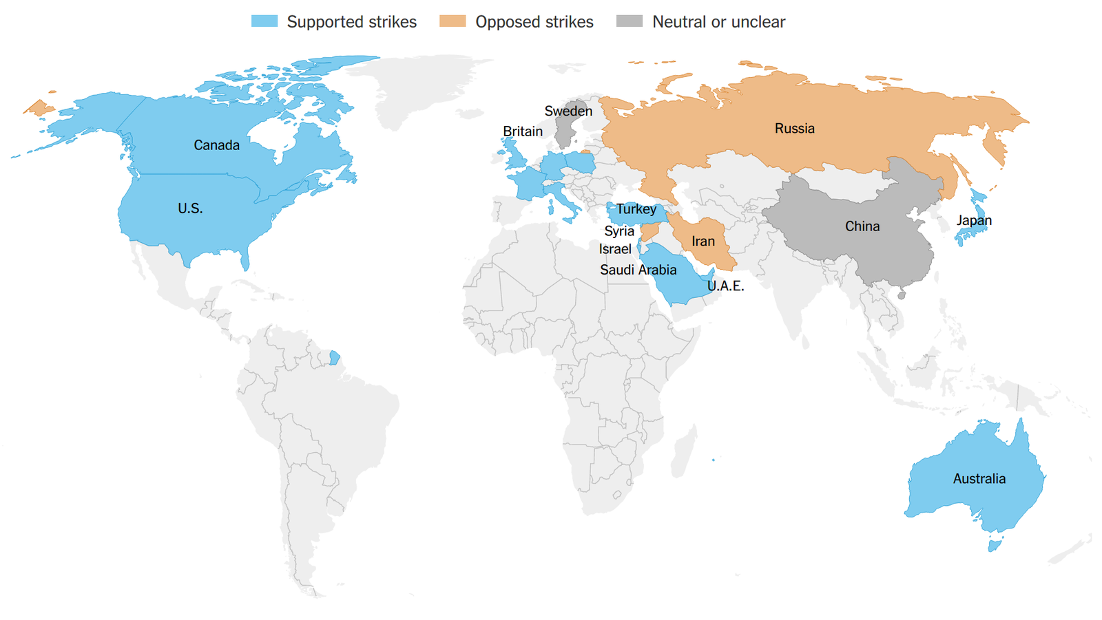 China has played it neutral on the strikes, with Hua Chunying of the Chinese Foreign Ministry saying, “We hope all sides will stay calm and exercise restraint to prevent the escalation of tension.”