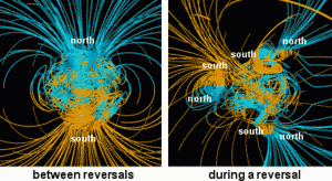 During a reversal the magnetic field won’t be zero, but will assume a weaker and more complex form. It may fall to 10% of the present-day strength and have magnetic poles at the equator or even the simultaneous existence of multiple “north” and “south” magnetic poles.