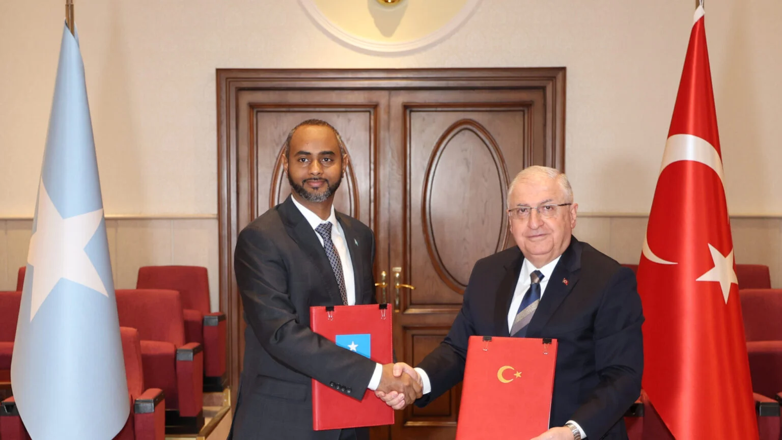 Turkish Defense Minister Yasar Guler (R) poses for a photo with Minister of Defense of Somalia Abdulkadir Mohamed Nur (L) during the signing ceremony of Defense and Economic Cooperation Framework Agreement between two countries in Ankara, Turkiye on February 08, 2024. (Photo by Turkish National Defense Ministry / Handout/Anadolu via Getty Images)